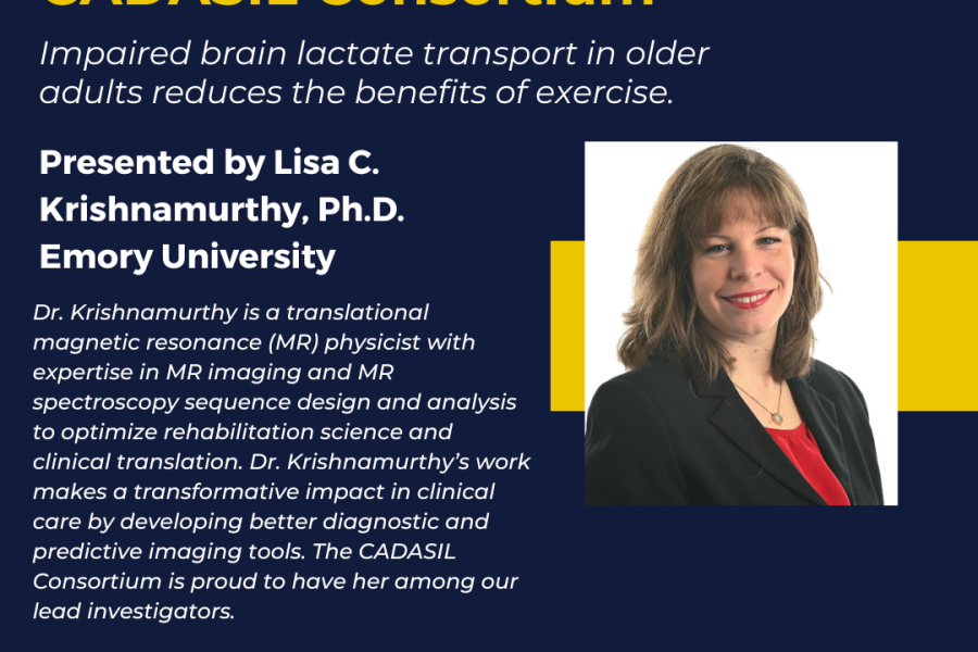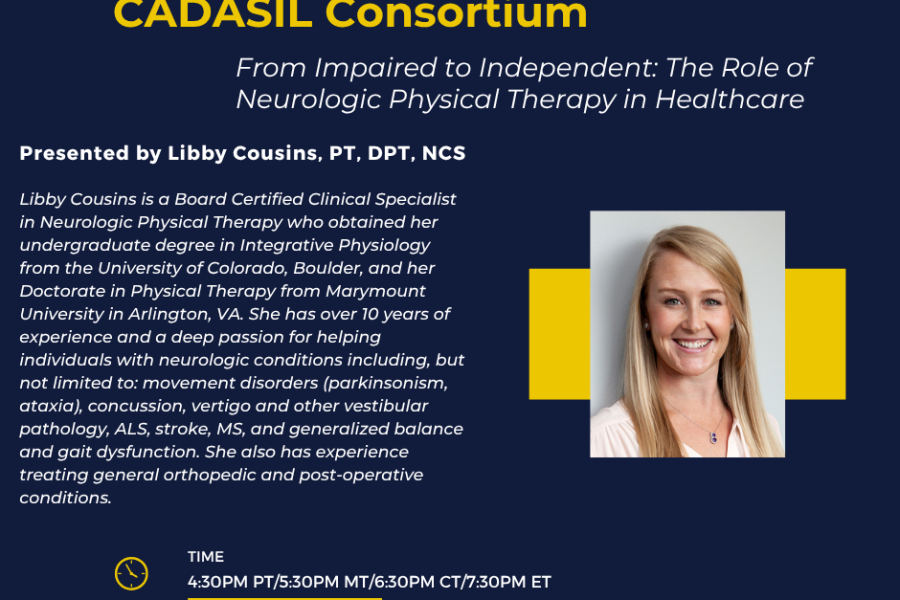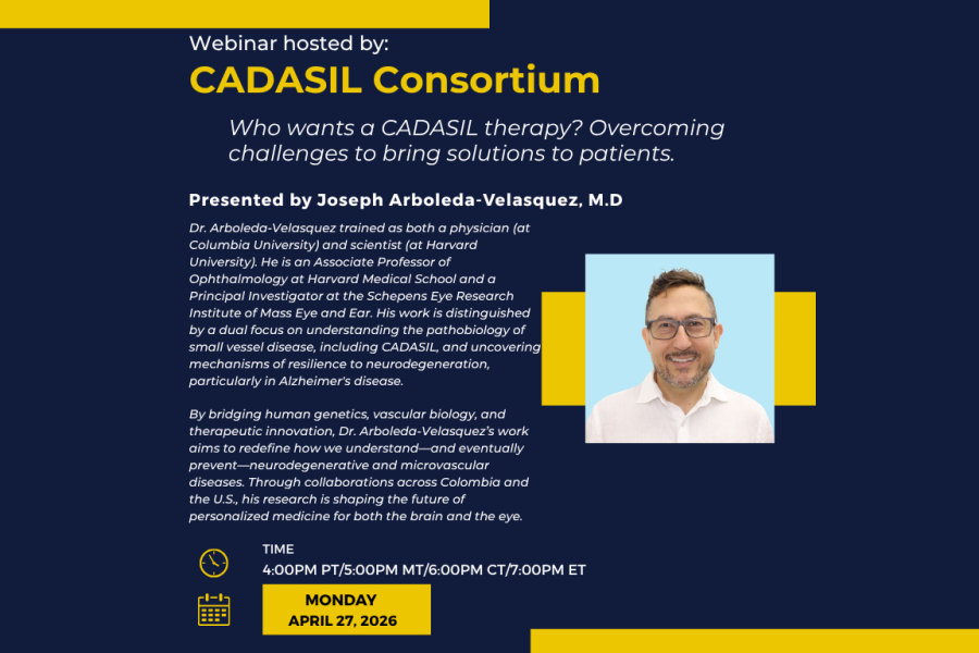 Webinars Next CADASIL Consortium Webinar April 27, 2026 Webinar Registration More Find all of our previous webinars (and more!) on our YouTube channel CADASIL Consortium YouTube Channel More Unraveling Complexity Lewy Body Dementia & Biomarker Insights Memory Loss and Dementia: intersections and overlap among neurocognitive disorders. From Impaired to Independent: The Role of Neurologic Physical Therapy in Healthcare Impaired brain lactate transport in older adults reduces the benefits of exercise. Identifying psychiatric symptoms due to early neurological illness CADASIL Consortium: An Update (2025) Cardiovascular Health and Brain Aging Retinal Imaging in Neurodegenerative Diseases Controversies in CADASIL Stories in Resilience Family Participation: The Key to Success in Genetic Research CADASIL and Naturopathy: A Holistic Approach to Coping and Resilience Palliative Care: Living Your Best Life with CADASIL The Family Planning and IVF Process in CADASIL Understanding the Caregiver Experience The Genetics of CADASIL The CADASIL Consortium Study Prioritizing People: How to Develop Trust and Meaningful Relationships through Community-Engaged Research CADASIL Update: Insights from Global Research Meetings MRI in CADASIL: What are we imaging and why? Navigating the CADASIL Journey: Understanding Genetic Counseling, Genetic Testing, and Next Steps Unraveling Sleep in Aging Learn about the New $12M NIH-Funded CADASIL Consortium Study